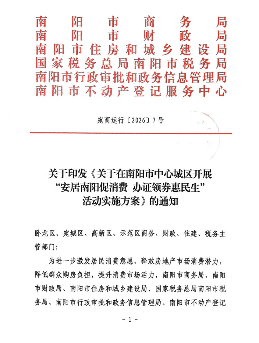 + 政策护航:马年春节期间政策加力。2026年1月29日,市商务局、市财政局、市税务局、市行政审批和政务信息管理局、市不动产登记服务中心六部门联合开展的“安居南阳促消费,办证领券惠民生”活动,在2026年1月31日—3月31日期间,全额缴纳住宅房屋交易契税的,按实际缴纳契税金额的10%返还消费券,用于商超、百货、餐饮、加油等其他消费。为春节购房助力!